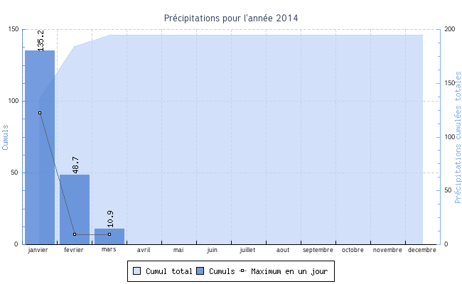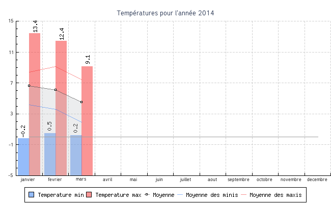 | janvier | -0.2 °C | 4.2 °C | 13.4 °C | 8.4 °C | 6.6 °C | 8.2 km/h | 37.4 km/h | S |